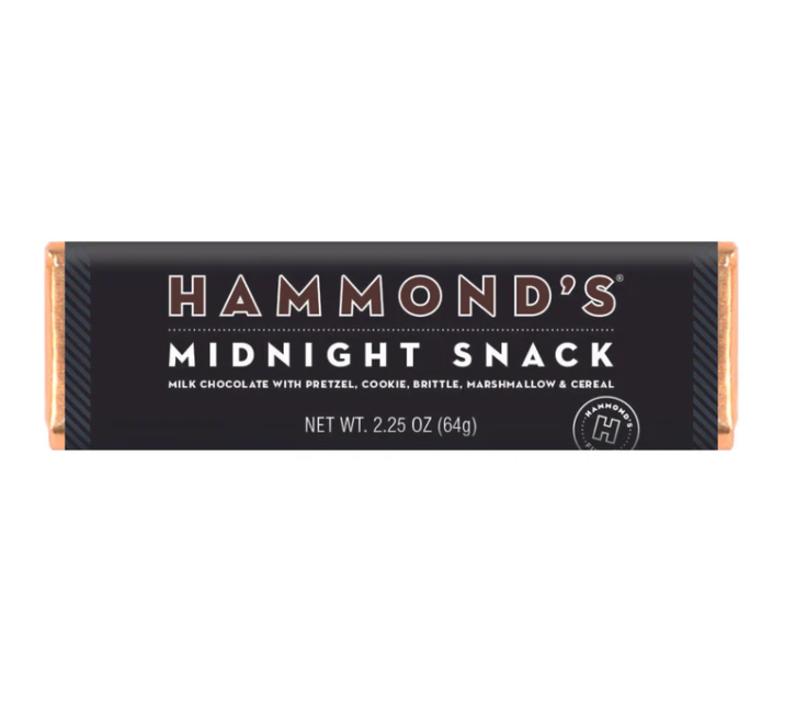 Satisfy your late-night cravings with Hammond’s Midnight Snack Chocolate Bar! This delicious treat combines the perfect combination of pretzels, cookies, brittle, marshmallow, and cereal, all enrobed in creamy milk chocolate. Perfect for those midnight munchies, this snack has everything you crave in one convenient bar. Indulge in the ultimate late-night snack with Hammond’s Midnight Snack Chocolate Bar today!