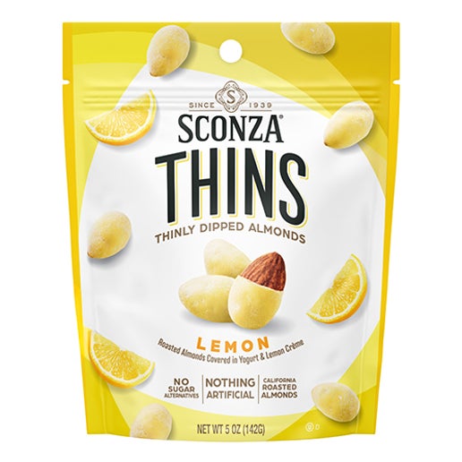 Sconza Thins Lemon Yogurt Almonds 5oz Peg Bags 6ct